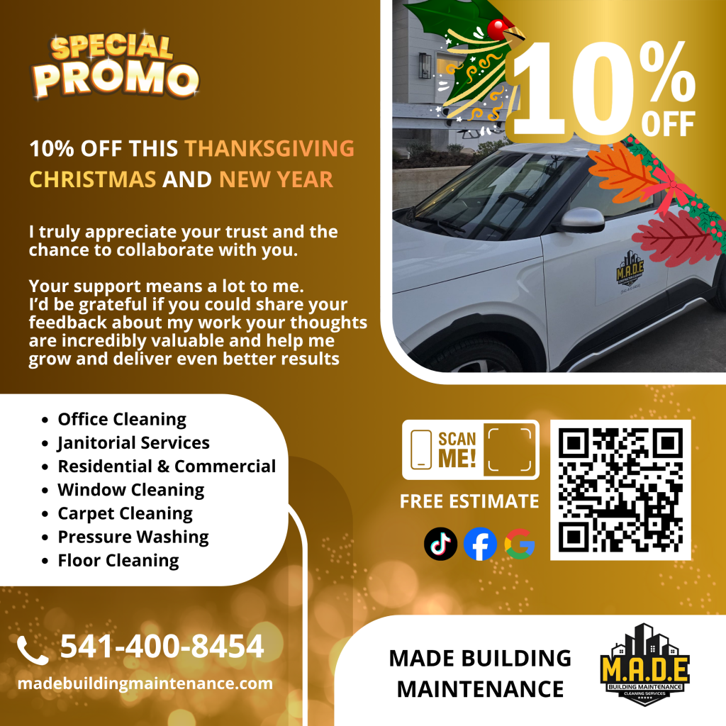 Contact MADE Building Maintenance Cleaning Services today for a free estimate or to request emergency service. We’re ready to help—whenever you need us.