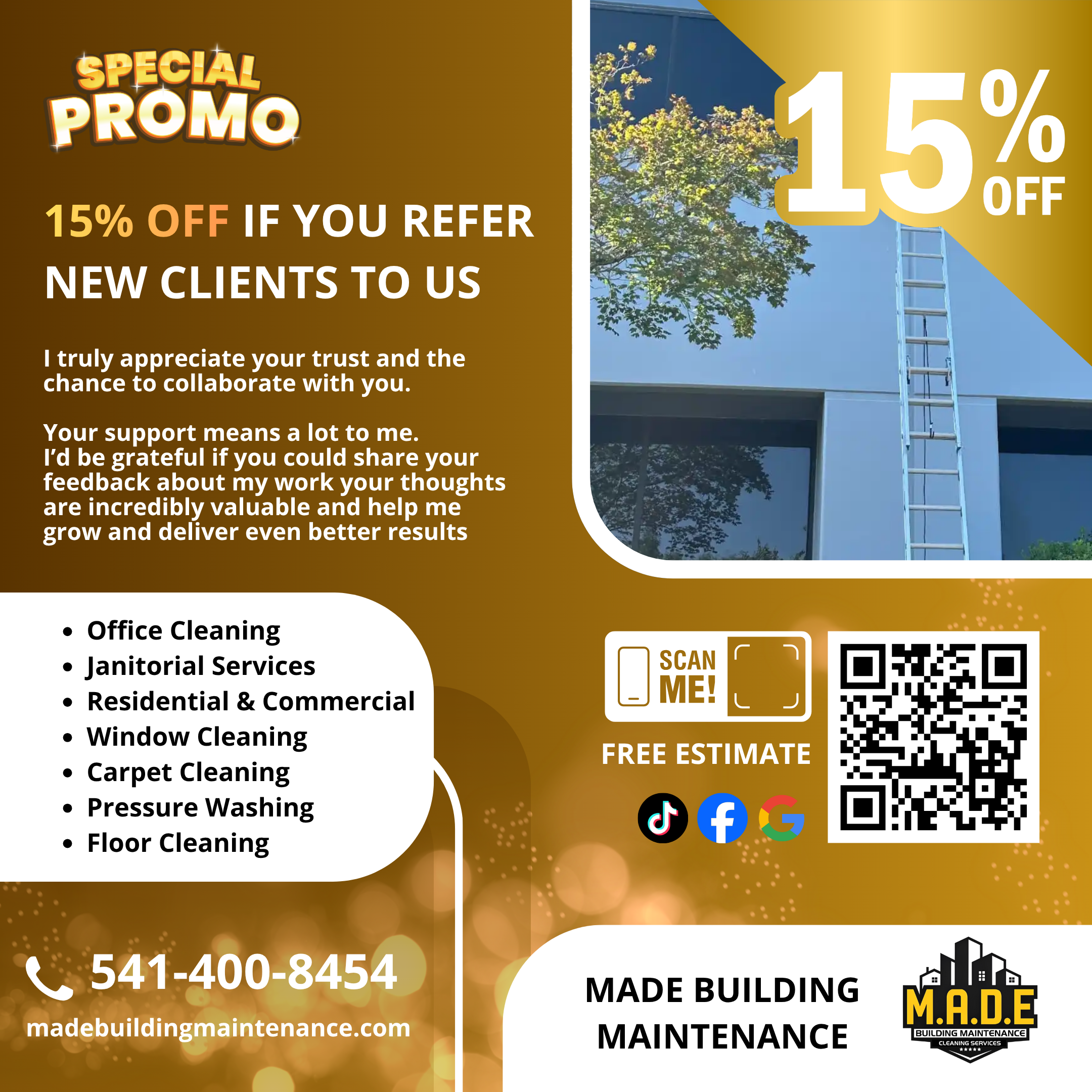 MADE Building Maintenance Cleaning Services has built its reputation on reliable service, honest work, and consistent results. Based in Camas, WA, we offer a complete line of all time cleaning services. Whether it’s pressure washing your exterior, deep-cleaning carpets, or prepping a rental for new tenants, we treat your property with care and professionalism.